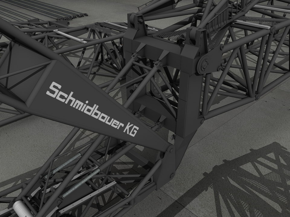 Hier sieht man die voll aufgerüstete Nadelbasis. Oben ist der Fuß des Drucklenkers zu sehen. Ein Stück darunter ist seitlich wieder eine Platte der Abspannung wie bei der schweren Spitze. In der Mitte nach links steht die Rückfallstütze des Nadelauslegers. Sie verhindert das die Nadel nach hinten überkippen kann. Unten schließlich ist der Fuß des Nadelauslegers montiert, auf dem wiederum der Fuß des Wipplenkers befestigt ist.